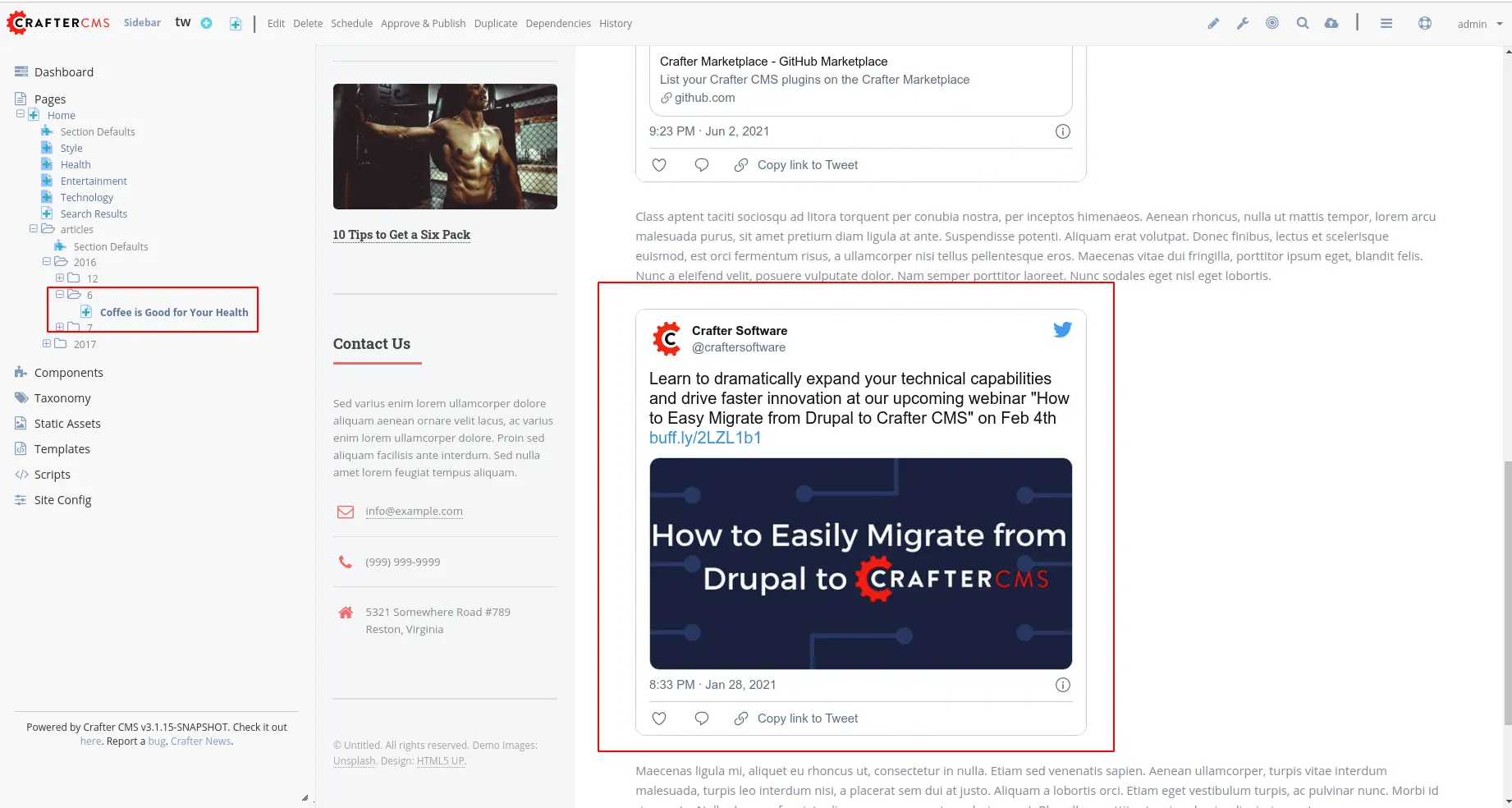We will introduce two ways to embed a Tweet to a Crafter site: static with raw HTML or dynamically rendering with JavaScript. While static raw HTML is more suitable for sites with static page content in HTML, dynamically rendering is more suitable for dynamic SPA sites such as React or Angular applications.