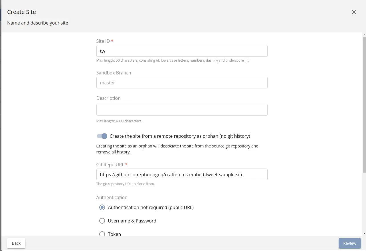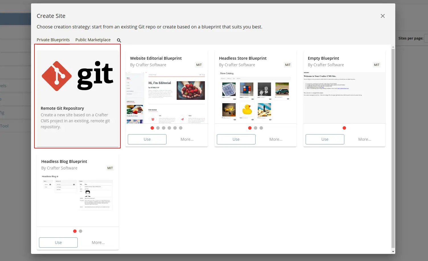 To create a new site with the above blueprint, from Crafter Studio, click create a new site from Git Remote Repository.