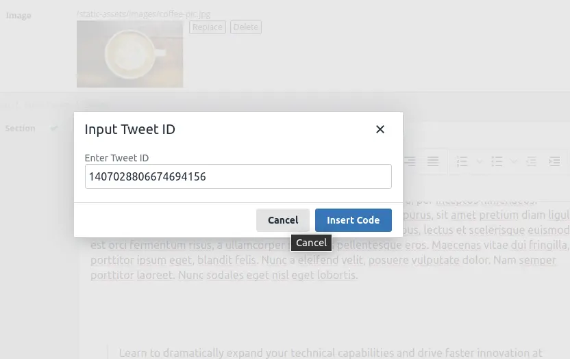We have two buttons to embed Tweets: Add Tweet Embed Dynamic or Add Tweet Embed Static. In the next section, we will discuss more details about this. Click on Add Tweet Embed Static to open a popup. Input any Tweet ID to insert raw html to the page.