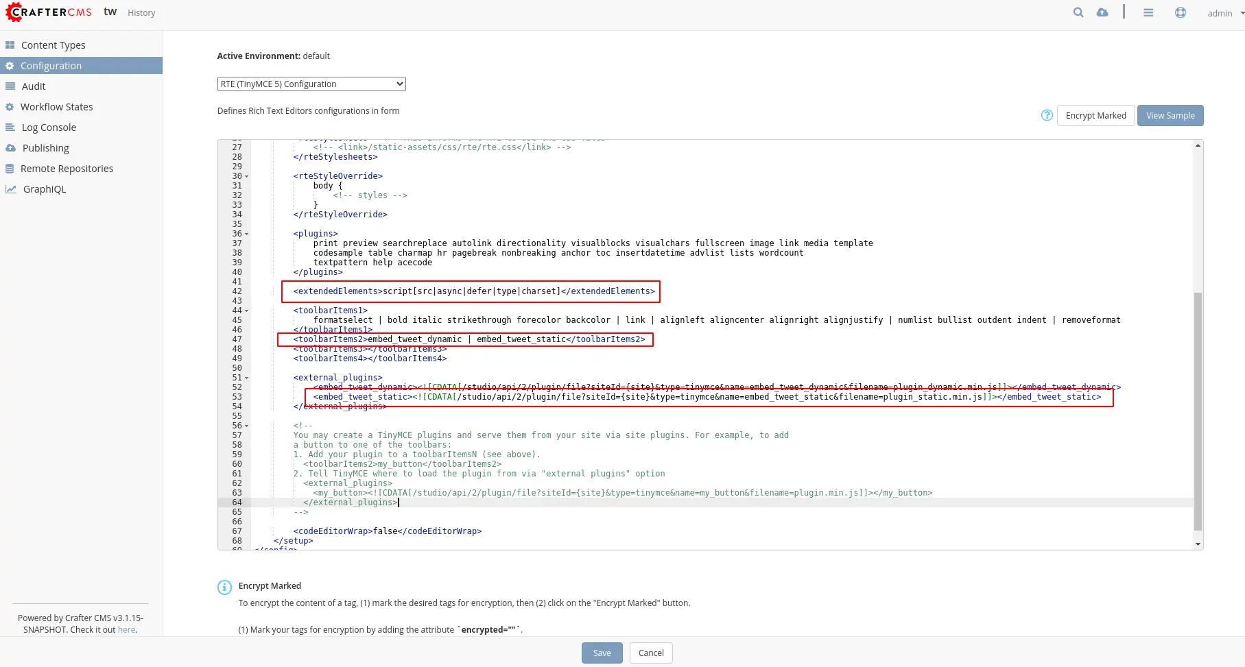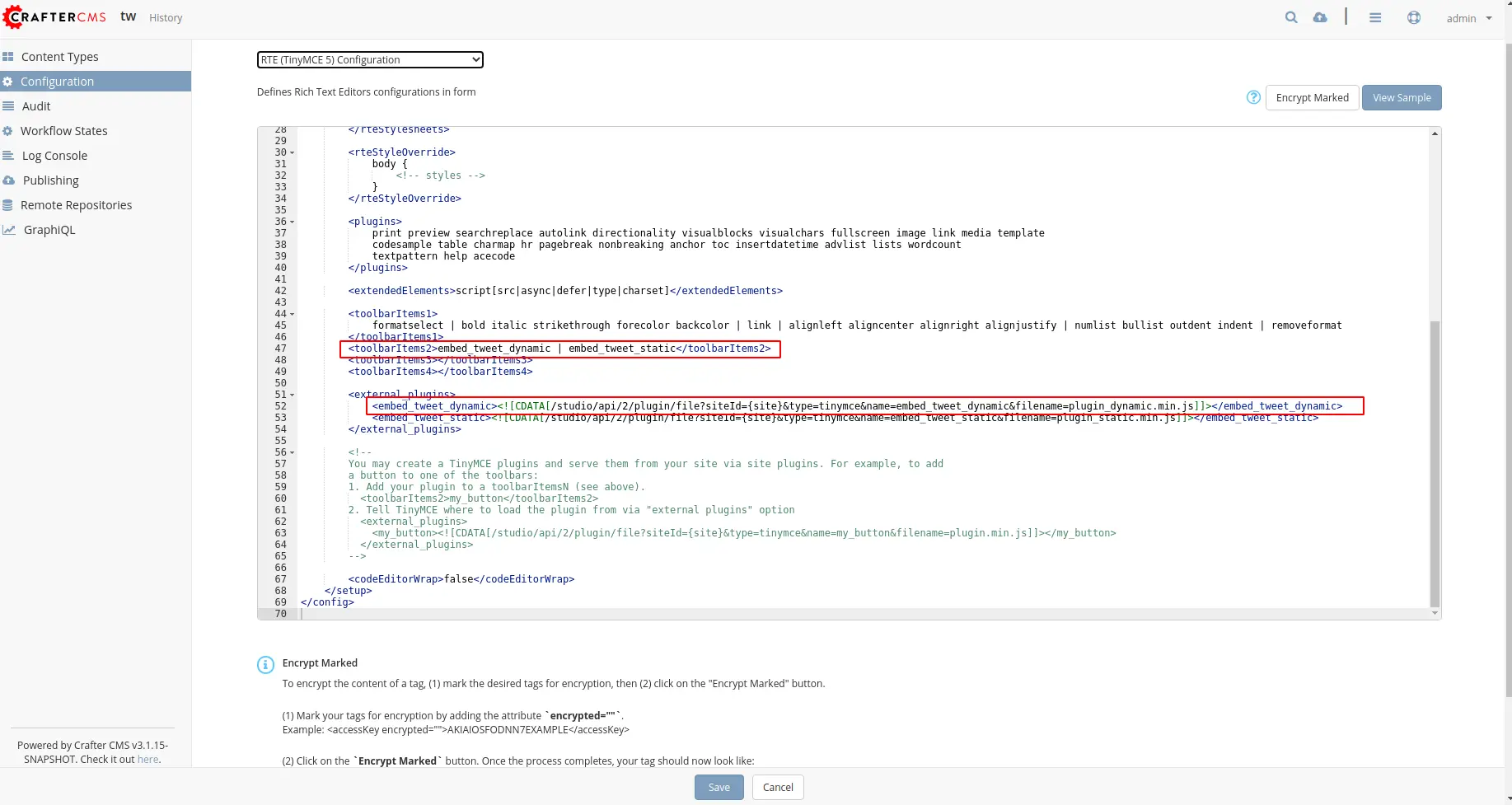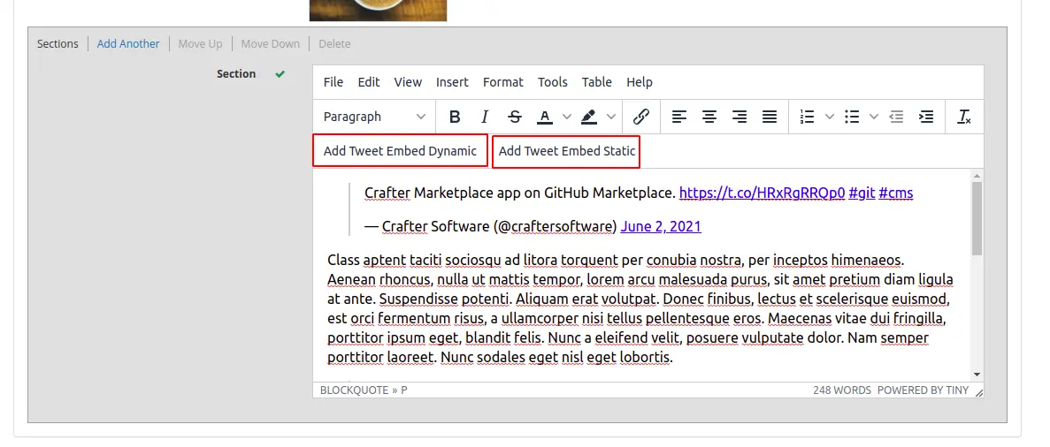 In this article, we introduced how to create a TinyMCE plugin to embed a Tweet in the RTE within Crafter Studio. The TinyMCE-rich text editor within Crafter Studio is extensible. This article is just an example of how we can add a plugin to it.