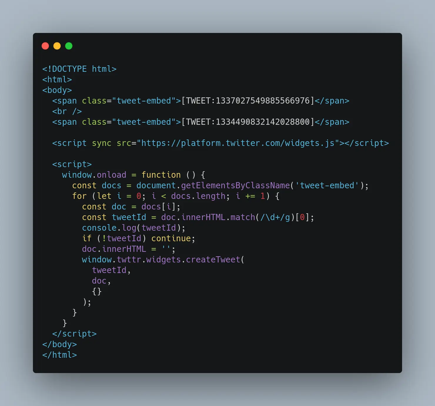 To serve this purpose, we only need to insert the Tweet ID to a page with a placeholder. While a user accesses the page, it dynamically replaces the placeholder content with actual Embed Tweets. Thanks to the Embedded Tweet JavaScript Factory Function, we can easily implement this approach. The placeholder is something like this: