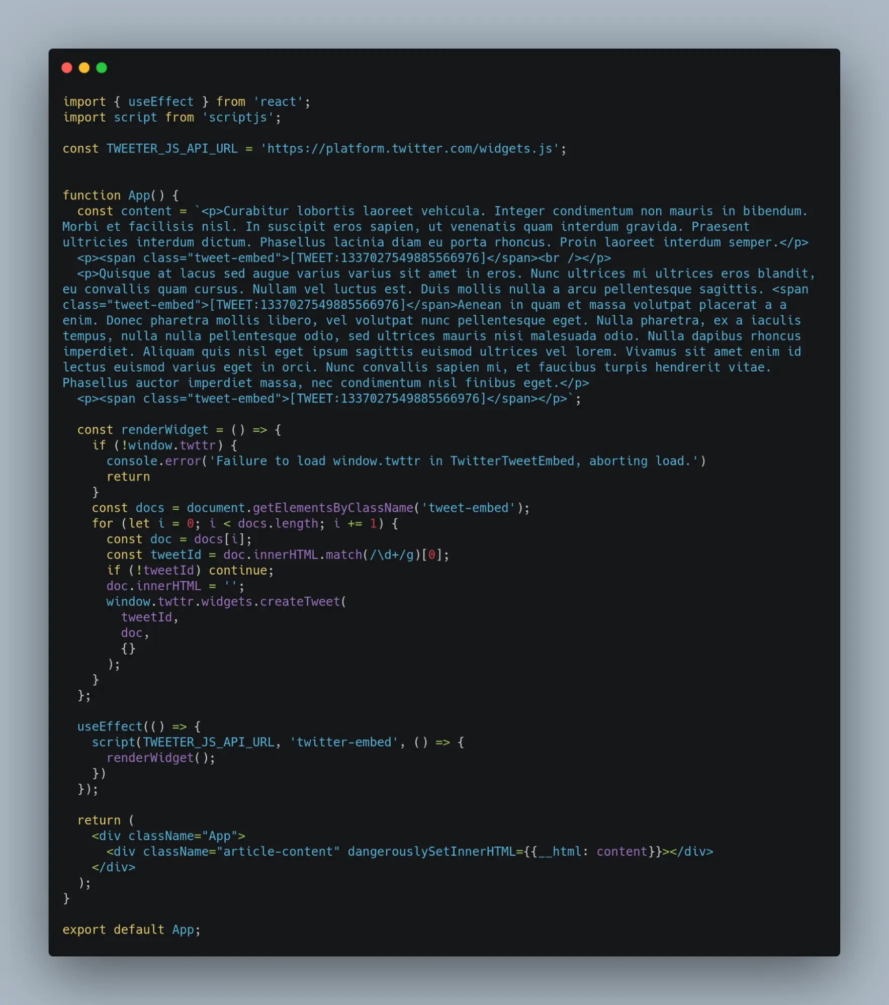 While adding raw HTML works for most static pages, there are many cases in which we need to dynamically render content. For example, the application is a SPA one with frameworks like React or AngularJS. In such cases, we may want to dynamically render Embed Tweets along with the content rendering.