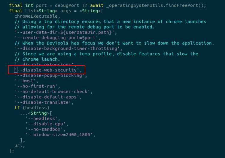 Update file `packages/flutter_tools/lib/src/web/chrome.dart` to include tag `--disable-web-security`