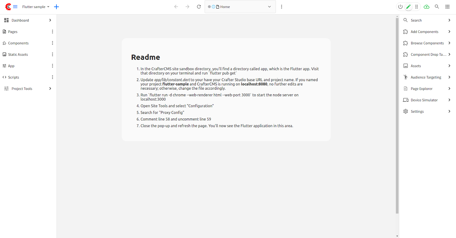 Update app/lib/constant.dart to have your Crafter Studio base URL and project name. If you named your project flutter-sample and CrafterCMS is running on localhost:8080, no further edits are necessary; otherwise, change the file accordingly.