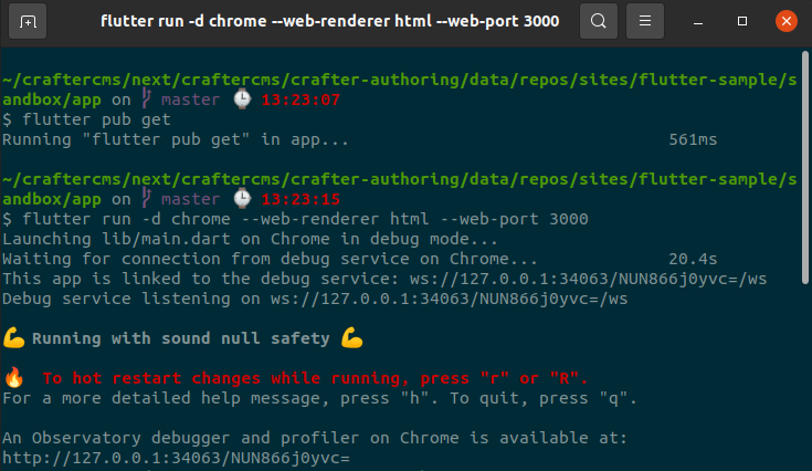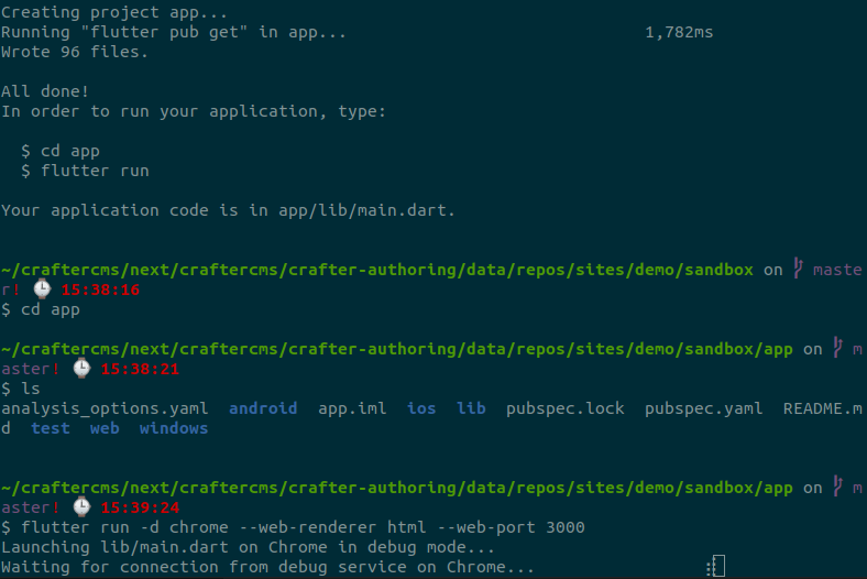 In the CrafterCMS site sandbox directory, you'll find a directory called app, which is the Flutter app. Visit that directory on your terminal and run `flutter pub get`