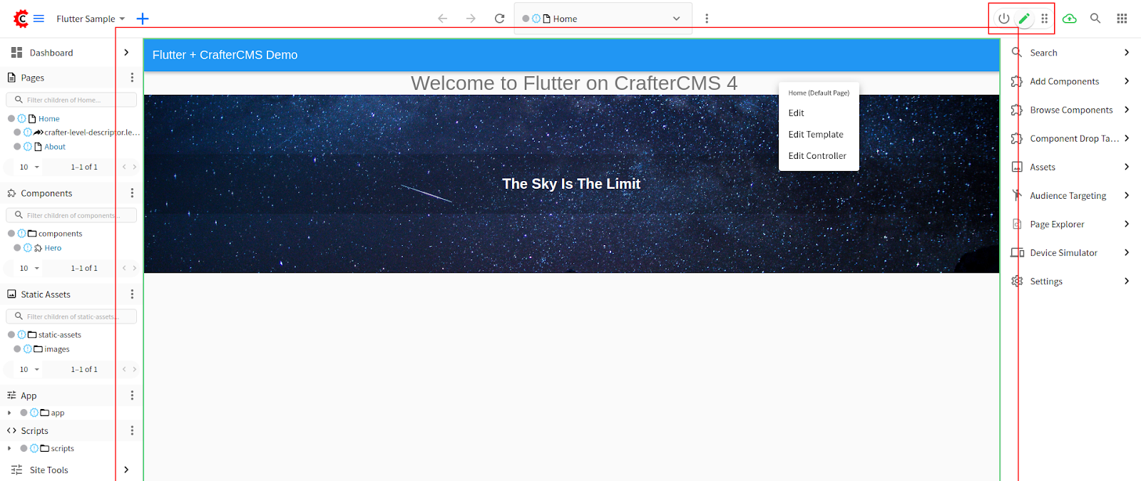 While the green pencil is active, click on the whole screen component, you should see a green box appears showing that the text is editable. Click on it and change your content to “Welcome to Flutter on CrafterCMS 4“.