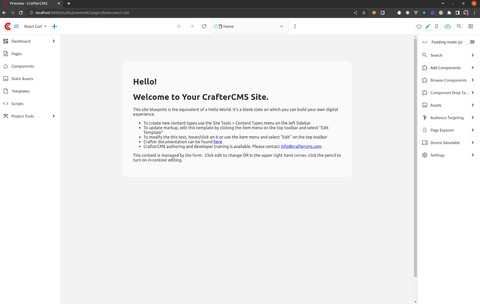 Step 2: Create a project in CrafterCMS and set it up to preview our React application running in Node JS. Now that our application is running let’s get the CMS set up and preview our application.
