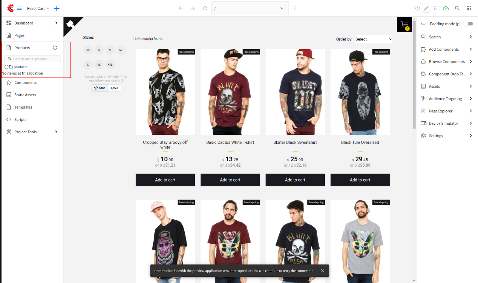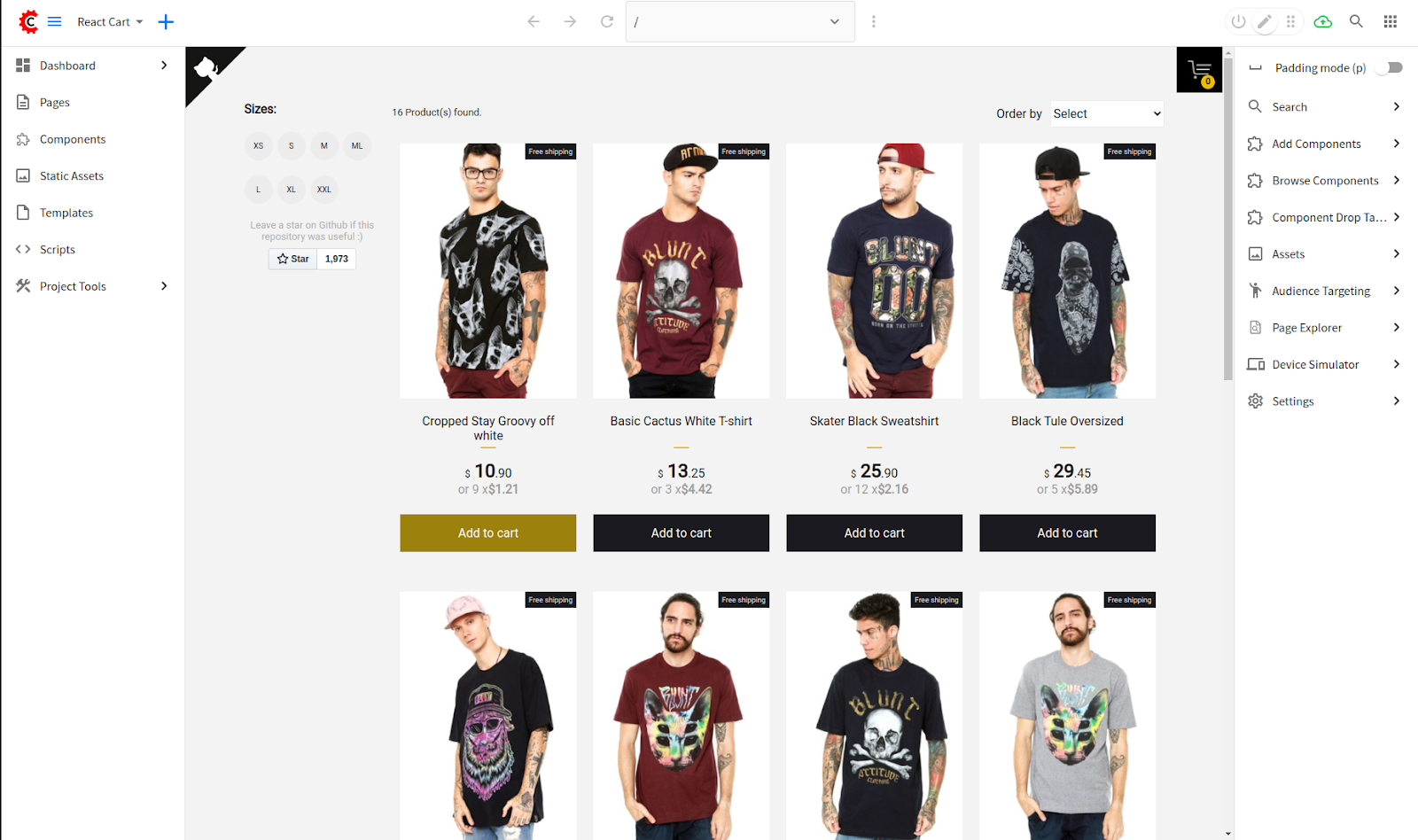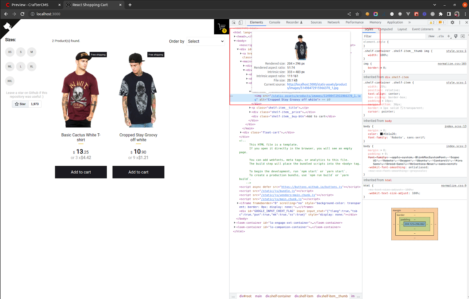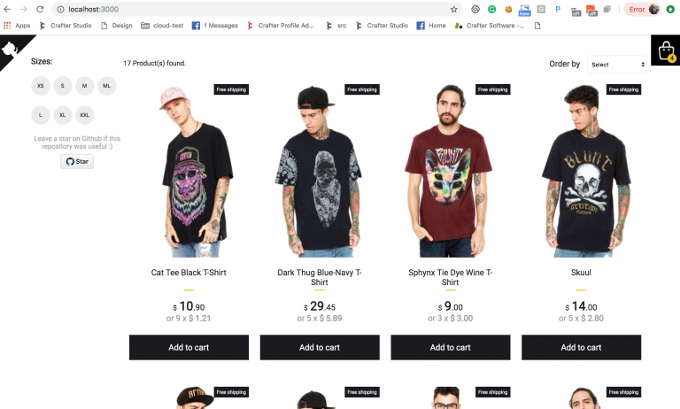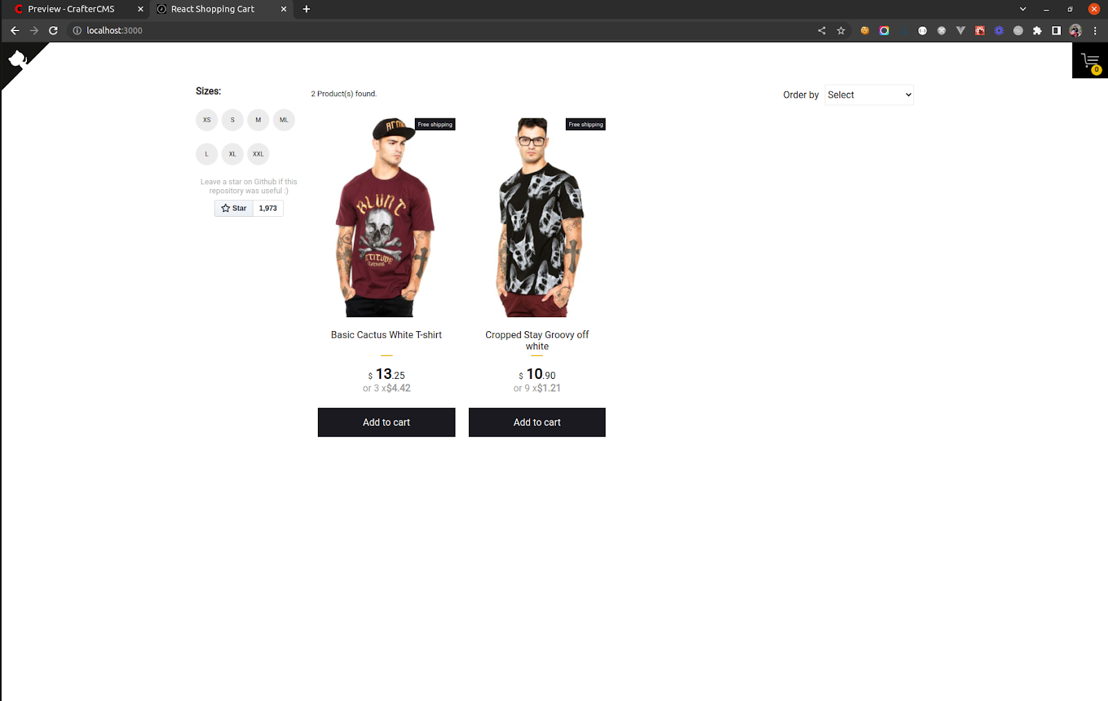 We are going to use this open-source shopping cart for this tutorial with some modifications. A clone that is tested to work with CrafterCMS v4 is here: https://github.com/phuongnq/react-shopping-cart. This tutorial will use phuongnq/react-shopping-cart clone.
