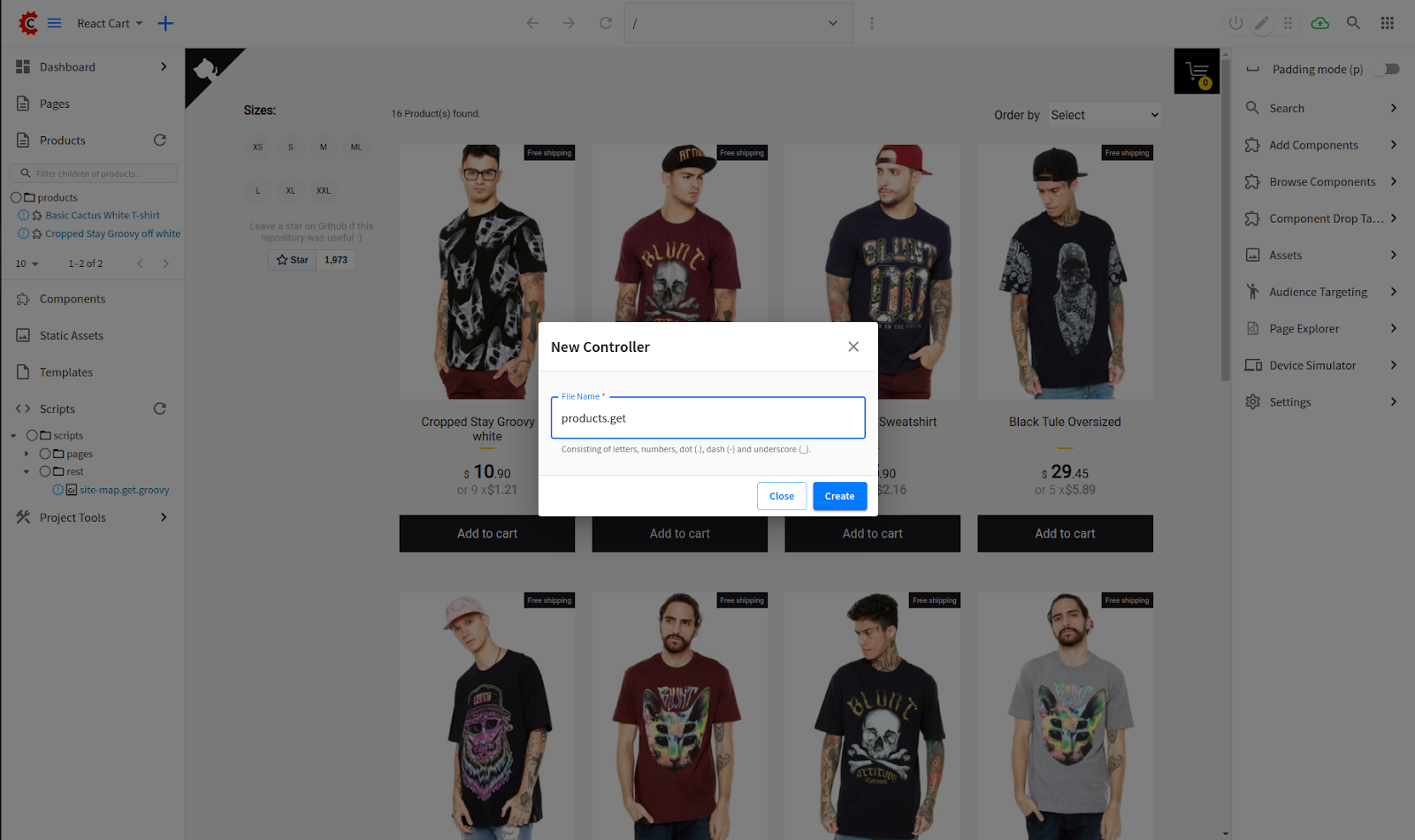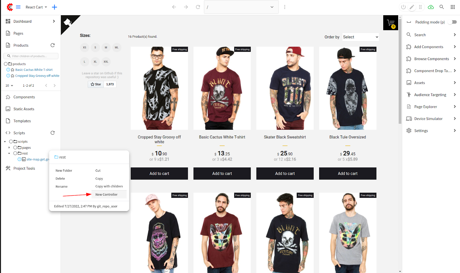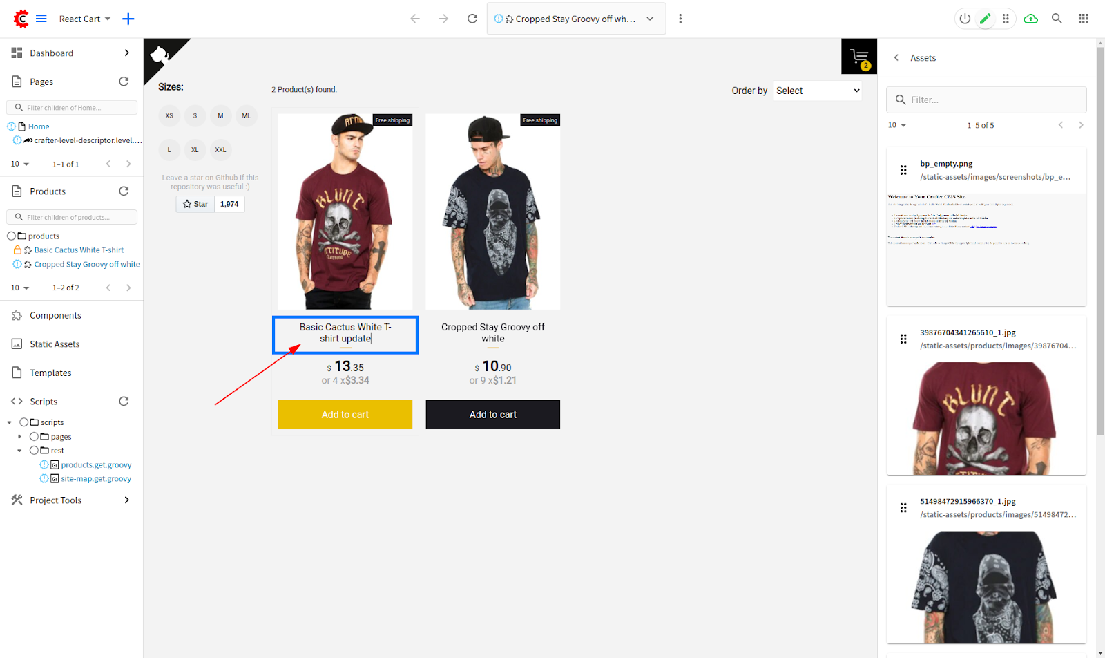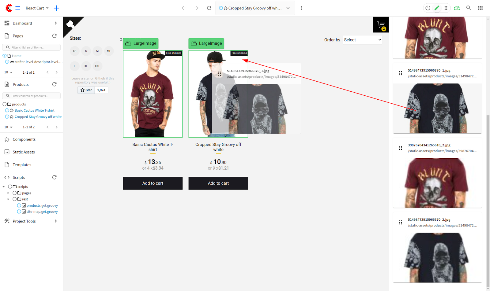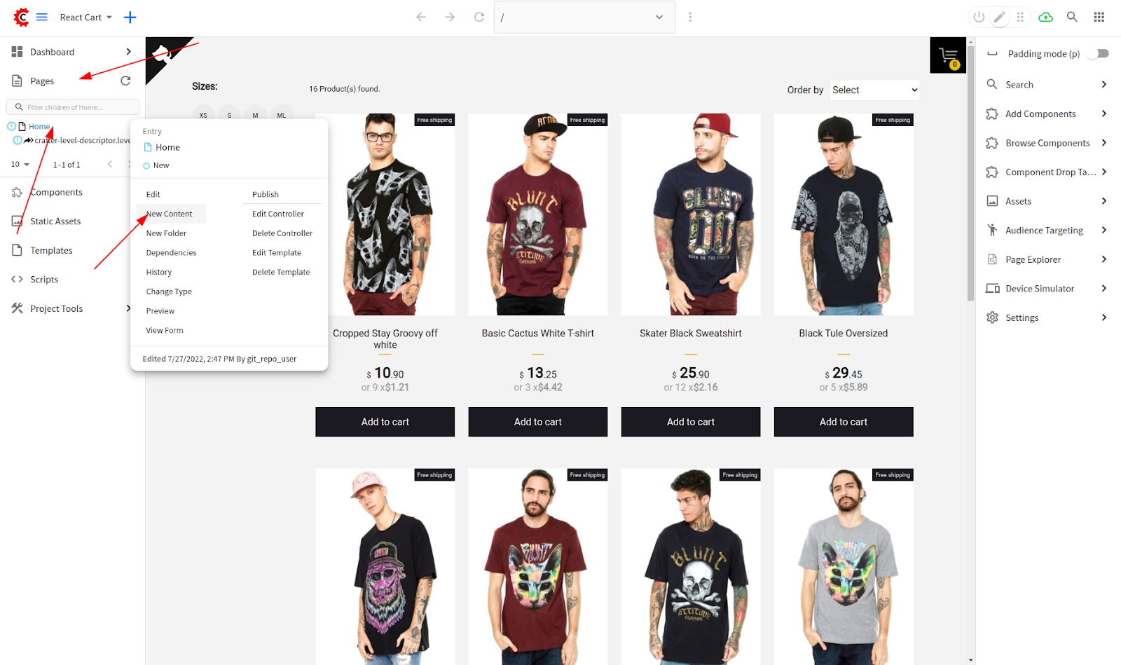 We are going to use this open-source shopping cart for this tutorial with some modifications. A clone that is tested to work with CrafterCMS v4 is here: https://github.com/phuongnq/react-shopping-cart. This tutorial will use phuongnq/react-shopping-cart clone.