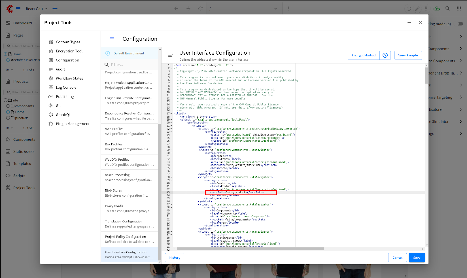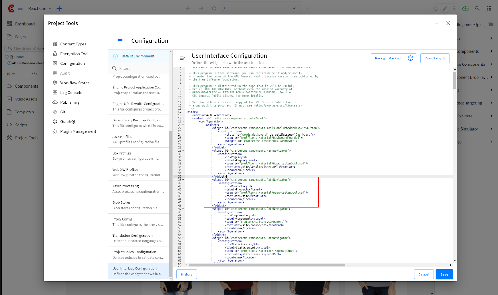 - Now, return to the User Interface Configuration. Let’s update the folder so that it shows only the products. We do this by modifying the path parameter for the widget.