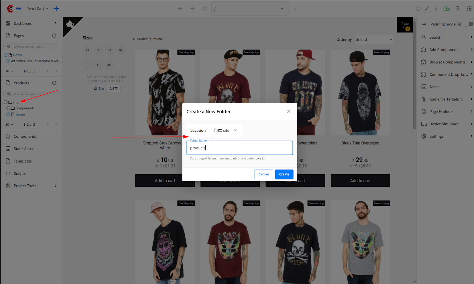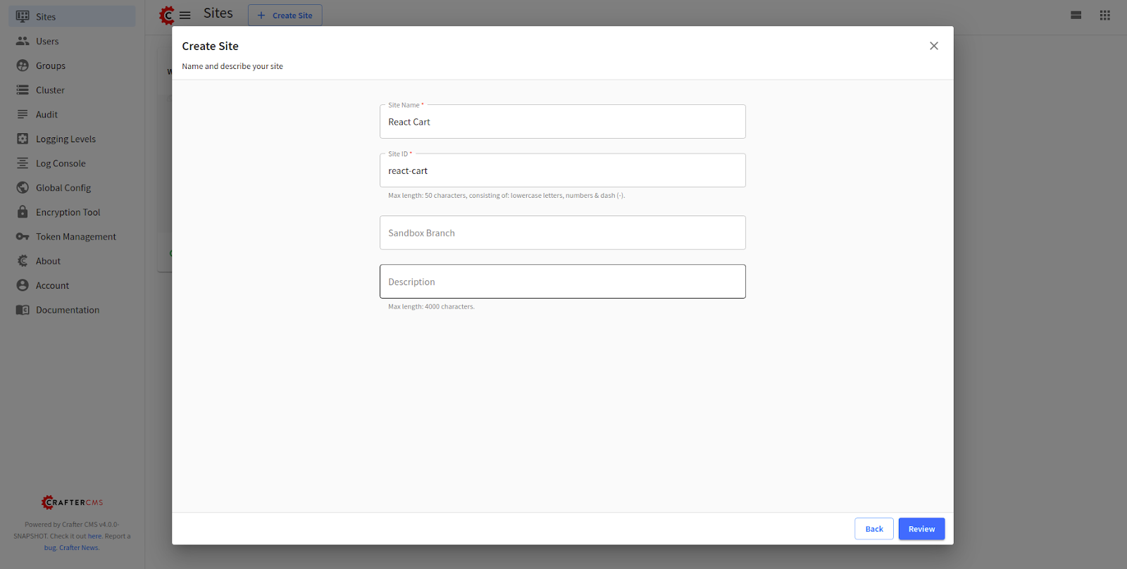 Create a new site from Remote Git Repository and use https://github.com/phuongnq/craftercms-react-cart-bp in the Git Repo URL and input Site Name with React Cart.