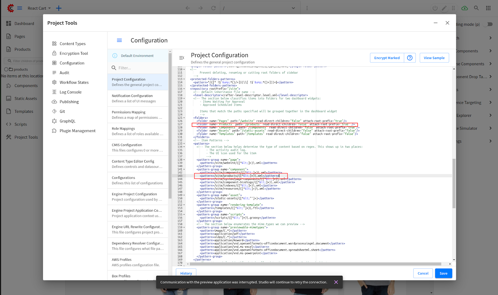 - Now let’s update the Project Configuration so that Studio better understands the content found under the /site/products path. In the Configuration tool open Project Configuration, add configuration under folders and patterns as shown below: