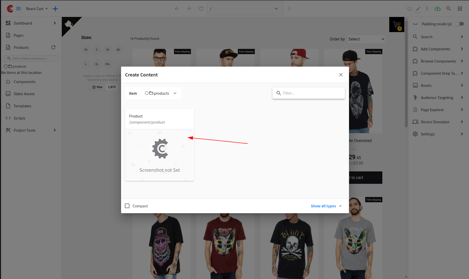 Back to the main dashboard and try creating content in the products area. If the previous steps were performed correctly, only Products component can be selected. Studio understands (based on the configuration) that this is the only type that is allowed to be used here and thus defaults to it.