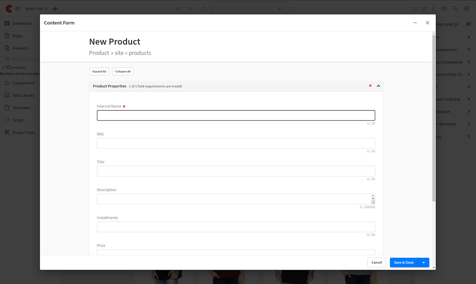 Now that your authoring tools are set up to make it easy to add products it’s time to create some product content. Using the New content option, and following the content on the site (or in the JSON response) create at least two products by right-clicking on the product folder then filling out the product form and saving.
