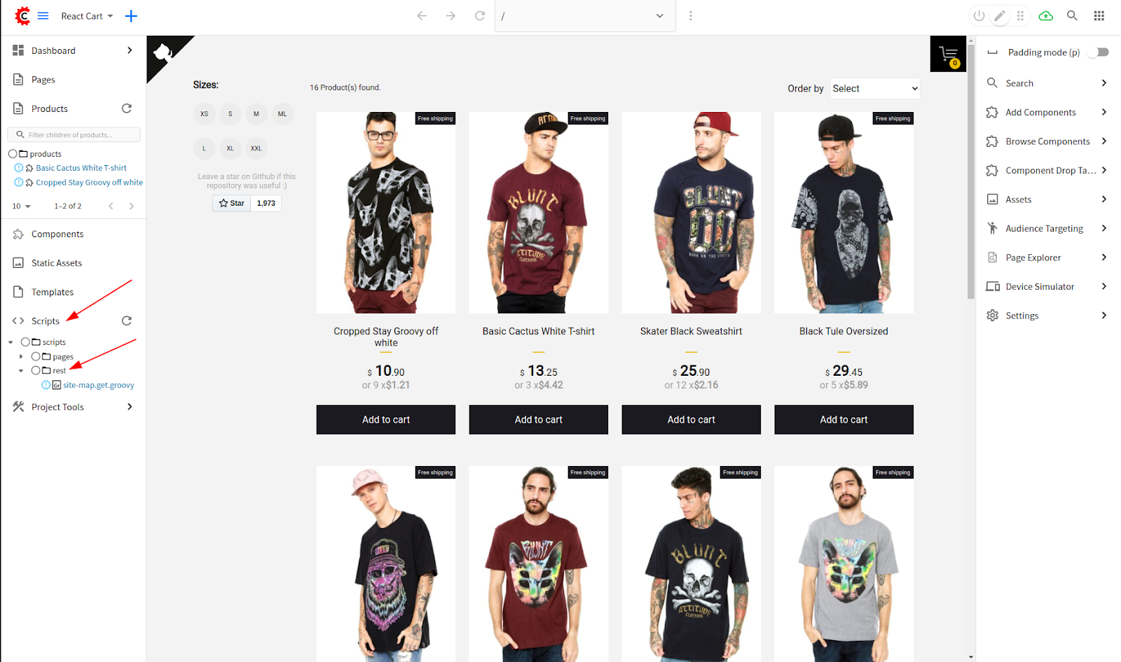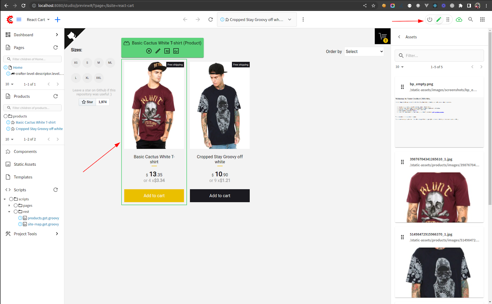 Clone https://github.com/phuongnq/react-shopping-cart/tree/feature/craftercms-xb and run locally with following commands: