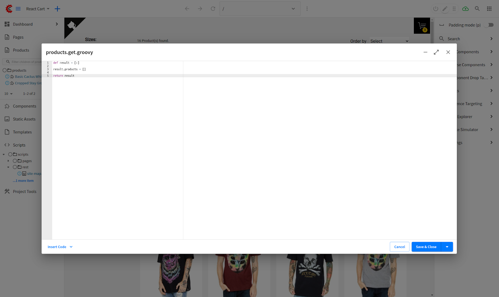 This code will result in an object with an empty products array. By returning the result value at the end of the script Crafter knows to marshal this object into JSON for us when the service is invoked via the URL.