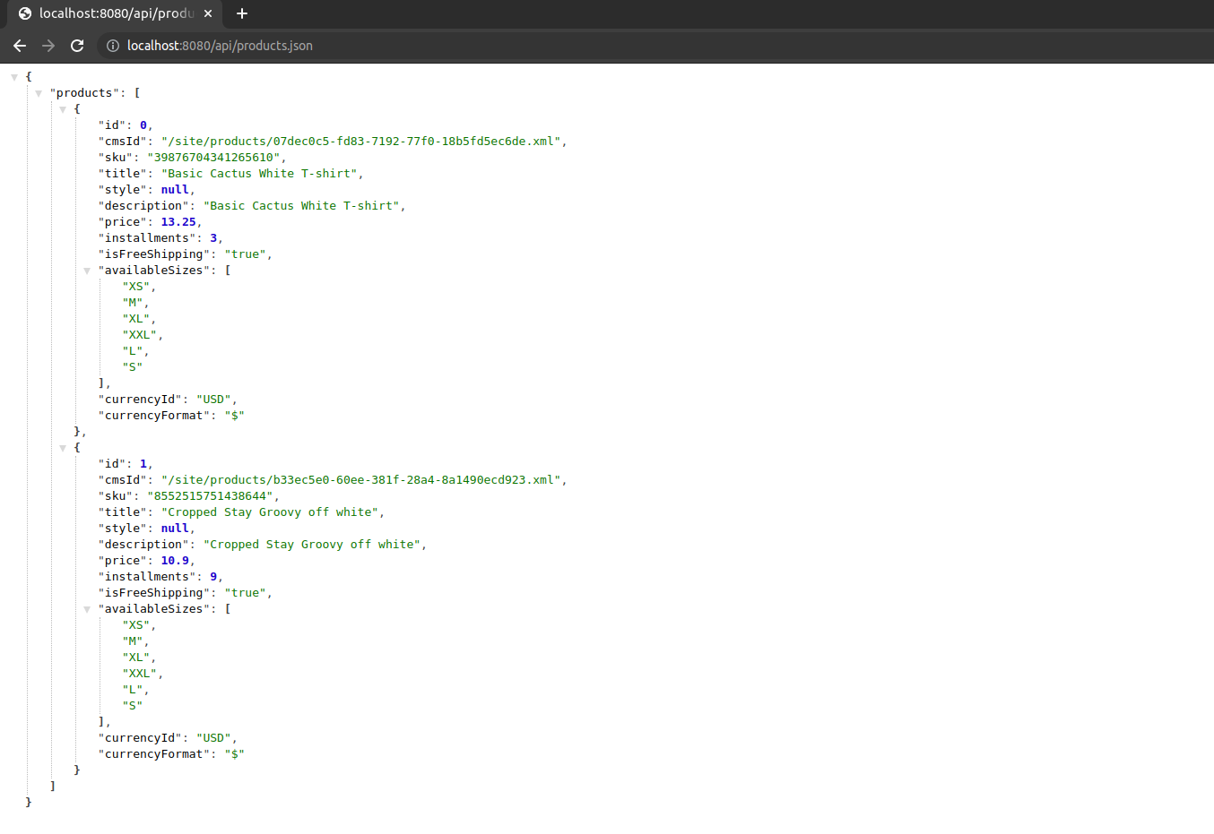 Go to http://localhost:8080/api/products.json in your browser and you will see the JSON representation of the object returned by the script.Go to http://localhost:8080/api/products.json in your browser and you will see the JSON representation of the object returned by the script.