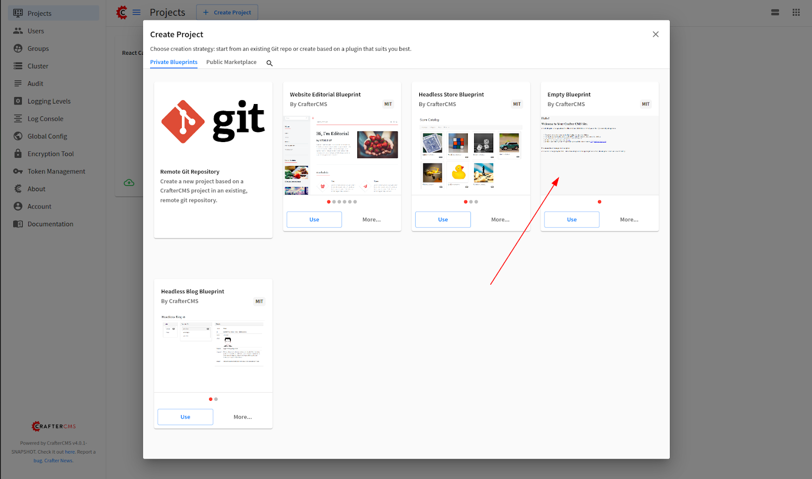 - Log in to Crafter Studio as an administrator and on Projects page, click the Create Project button.
