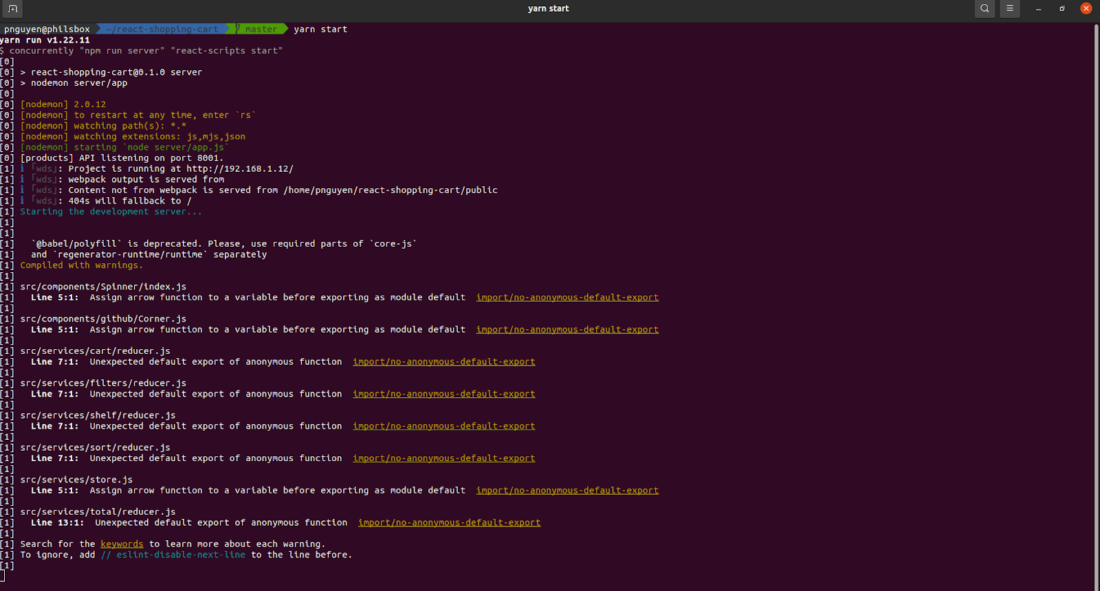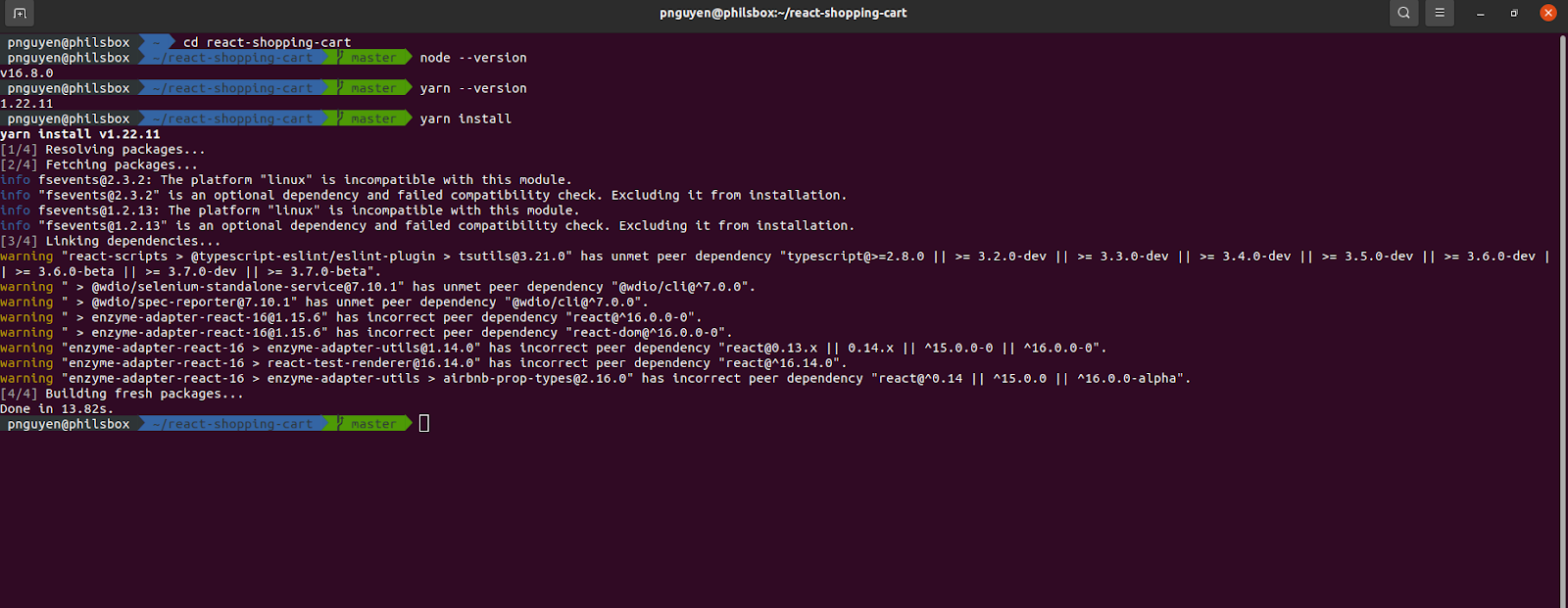 - Change directory into the react-shopping-cart folder that was created and run ``yarn install``. This will install the libraries necessary to run your application.