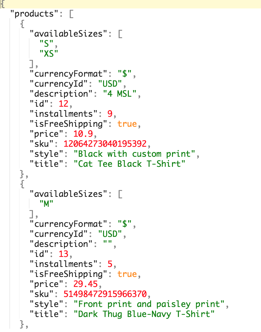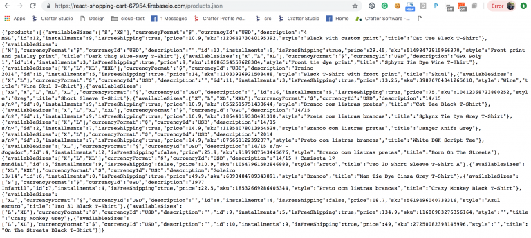 This application is pulling content for the product catalog in a JSON feed format from the following URL: https://react-shopping-cart-67954.firebaseio.com/products.json