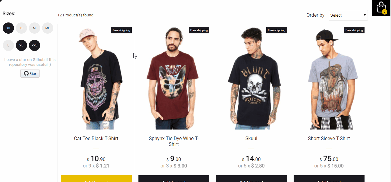 With these criteria in mind, we found this terrific open source React-based shopping cart application by Jefferson Ribeiro: https://github.com/jeffersonRibeiro/react-shopping-cart, Thanks, Jefferson!