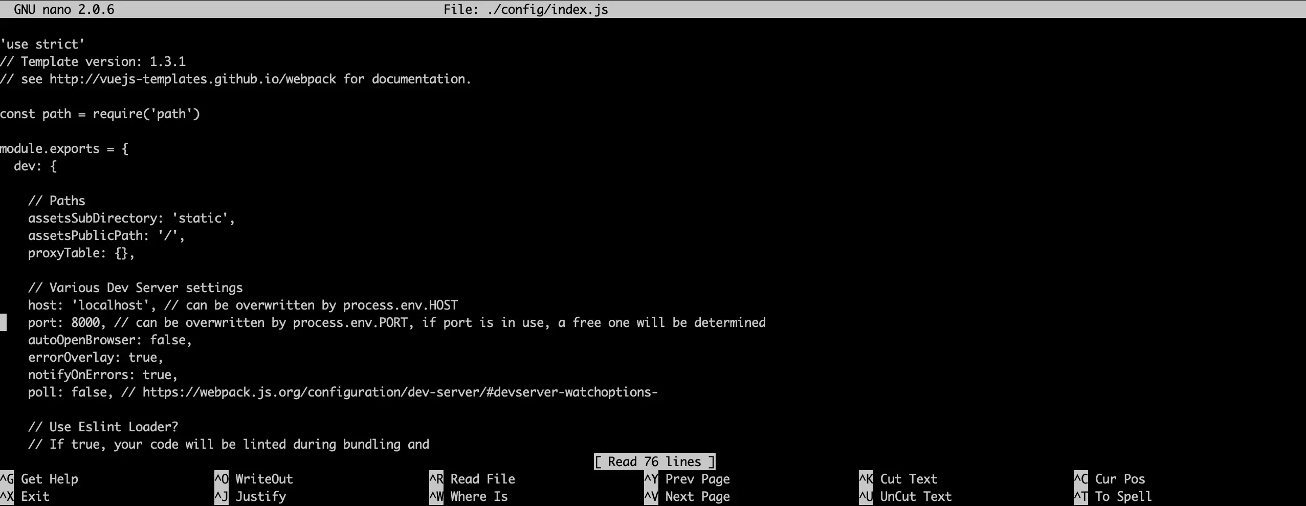 - This application starts on port 8080 by default which is where we will run Crafter later. Since 8080 is less typical for NodeJS we'll switch the port port on this app to something more conventional, say 8000. Edit ./config/index.js and modify the port value.