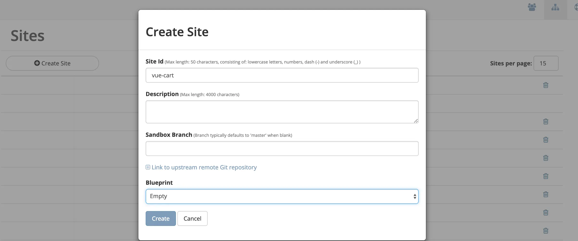 - Following the picture above, populate the dialog. Give the site an ID and select “Empty” blueprint then click the Create button. Once complete, you will see your empty site previewed in the Crafter Studio application. Now we want to tell Crafter Studio that our application is not running in Crafter Engine, but instead on NodeJS @ port 3000.