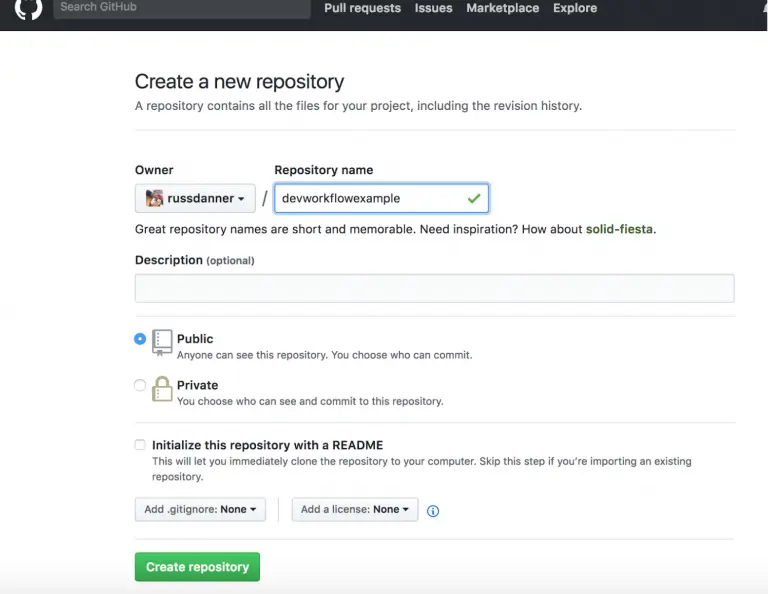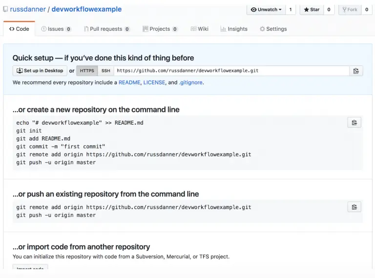 On Github, once created you will see the following screen. Here you will note the repository URL (https://github.com/russdanner/devworkflowexample.git) which you will need for the next step. Also, if you’re trying to create an upstream for an existing project (out of scope for this blog), you’ll find the instructions below in the “push an existing repository from the command line” section.