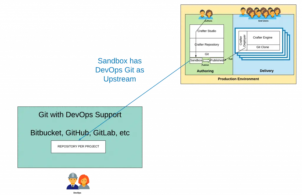 Note that the repository is what the Git community refers to as an “upstream” remote repository. That means in a sense the Production Sandbox becomes subordinate to it from a Git log perspective. This upstream repository is where content and development work will be merged before making its way to the production Sandbox and ultimately to the Published repository and the delivery nodes themselves. Also, note that nothing changes about the publishing and deployment configuration and topology of the Production environment.