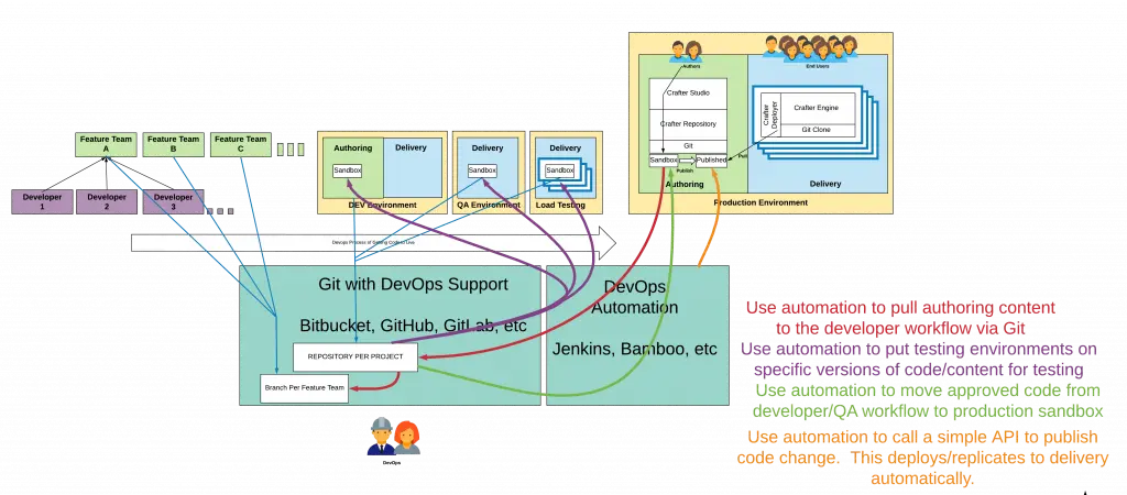 - Third: Because Crafter is Git-based you can natively support your ideal DevOps process for Continuous Integration and Delivery (CI/CD).