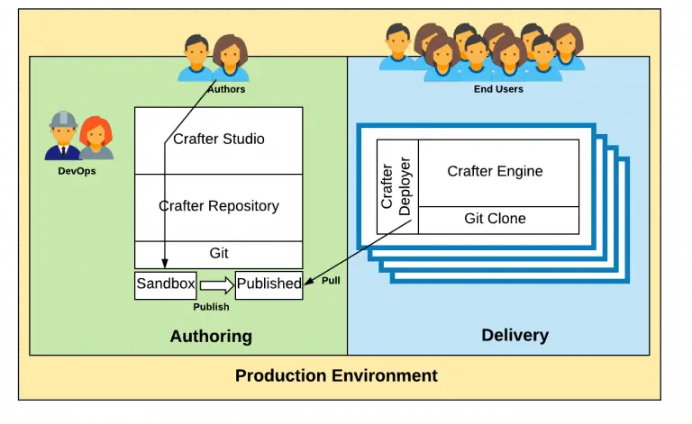 The authoring environment is akin to a work and test area for the authors. Relative to the live site or app the content authors are deploying content to, the Crafter Studio (and the Sandbox repository) where they edit, preview and approve content is what we would call a lower environment. Work is promoted from the lower environment (authoring) to the live environment (delivery.)