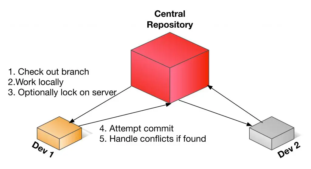 Back to developers: In the past, we had CVS, SVN along with many others. These SCM systems provided basic version management as well as branching and tagging but fundamentally the system was a centralized model. With such solutions, there is a single central store and source of truth for the code base.