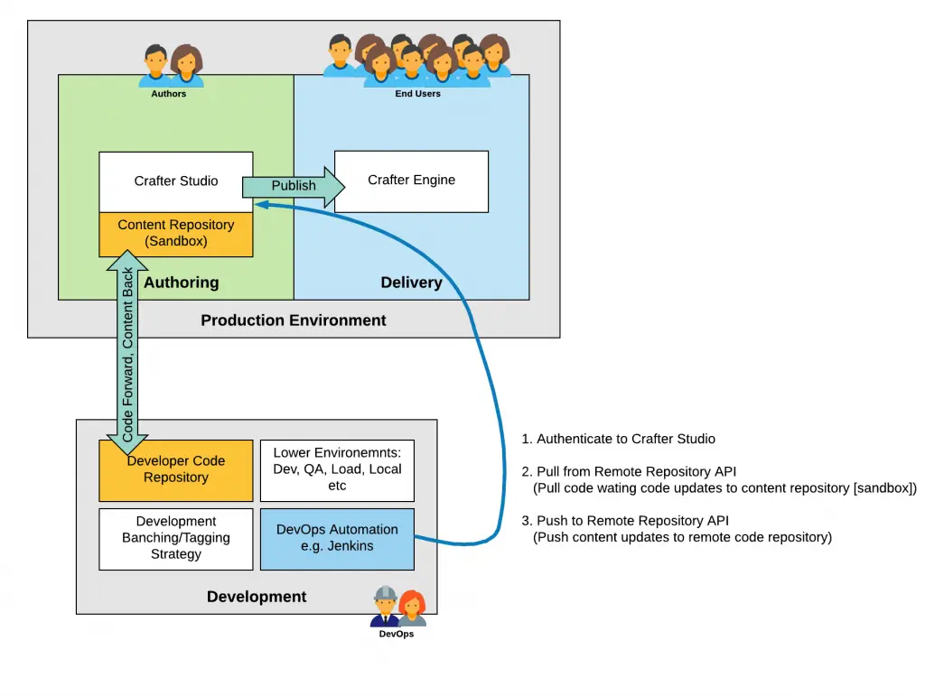CrafterCMS’s Git-based repository is the foundation of the automation. Our automation running in Jenkins is going to leverage API’s within the authoring environment (Crafter Studio) to sync code and content with the development process. APIs will also be used to publish code synced to authoring to the Production delivery infrastructure.