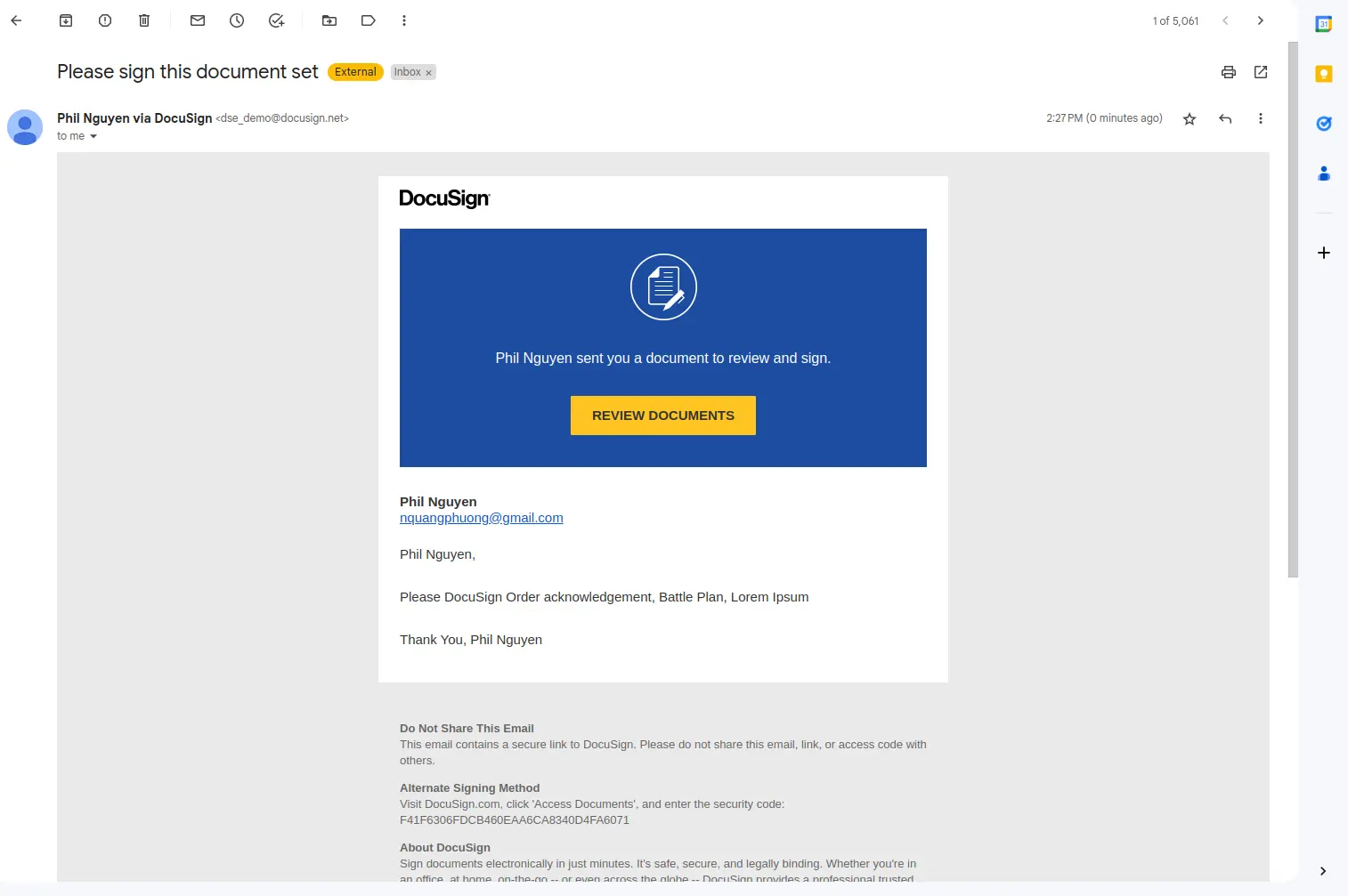 An email is sent to the signer email with the document to sign:curl --location --request POST 'http://localhost:8080/api/plugins/org/craftercms/plugin/docusign/sign.json?crafterSite=YOUR_PROJECT_ID' \ --header 'Content-Type: application/json' \ --data-raw '{ "signerEmail": "SIGNER_EMAIL_ADDRESS", "signerName": "SIGNER_NAME" }'