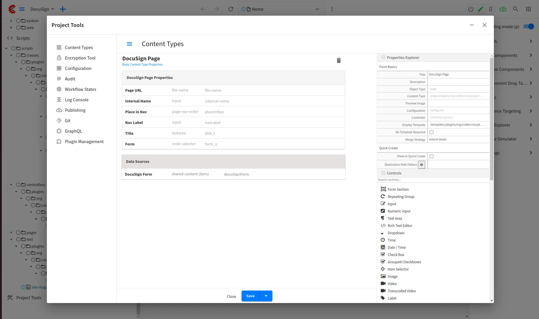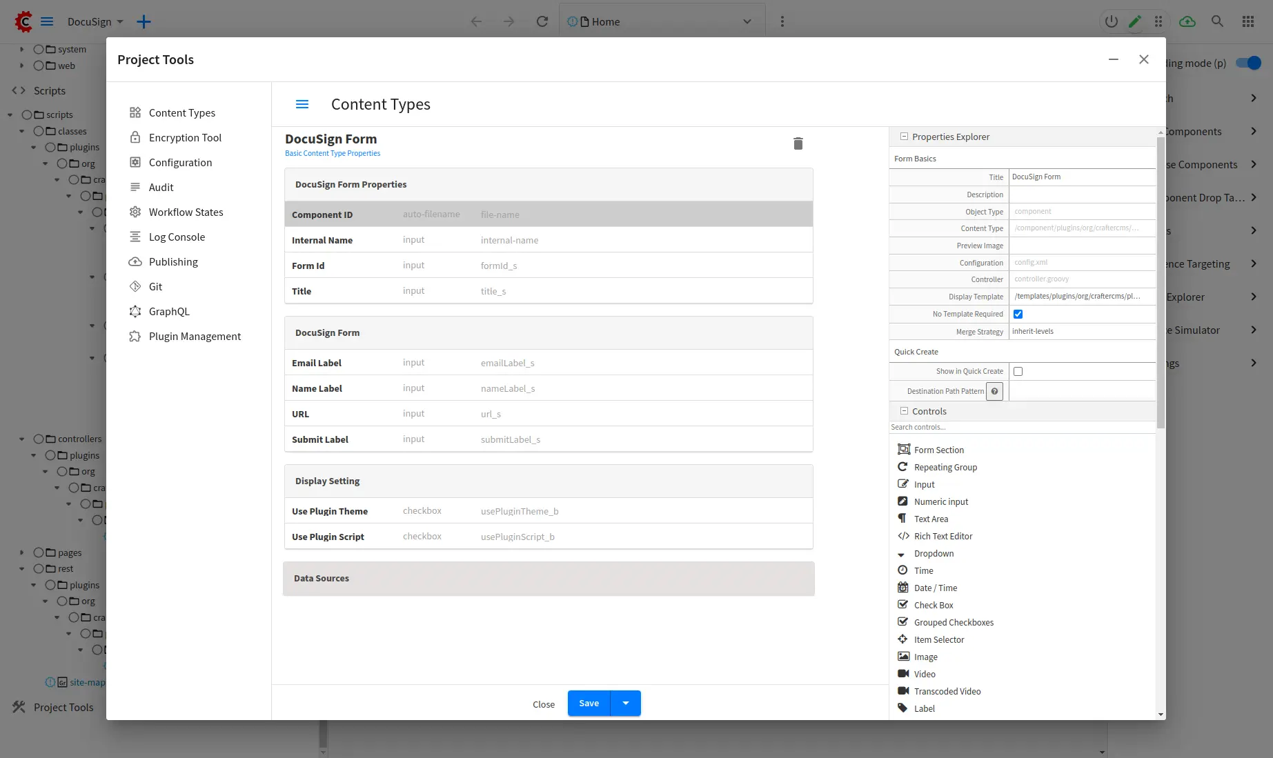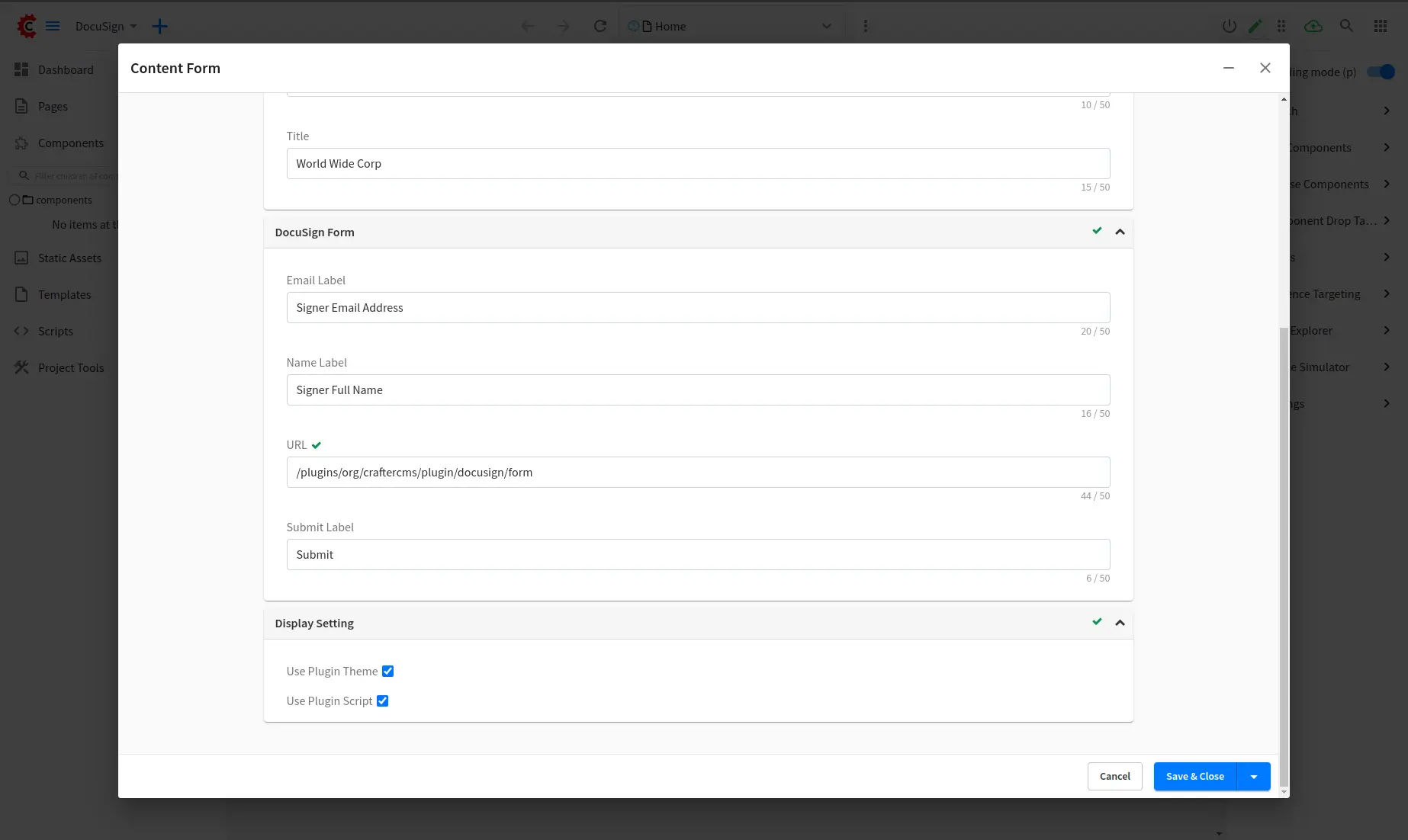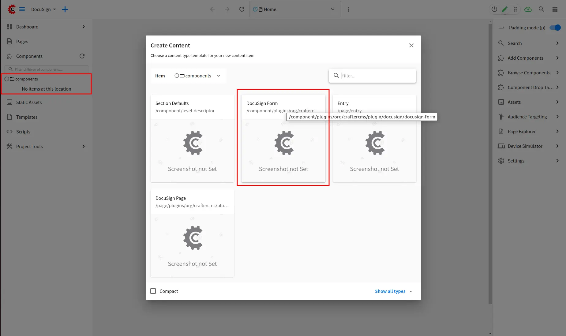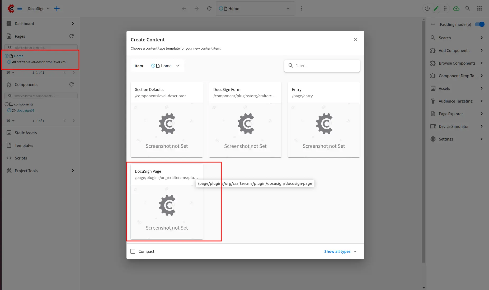 Create a form with /component/plugins/org/craftercms/plugin/docusign/docusign-form/component/plugins/org/craftercms/plugin/docusign/docusign-form content type