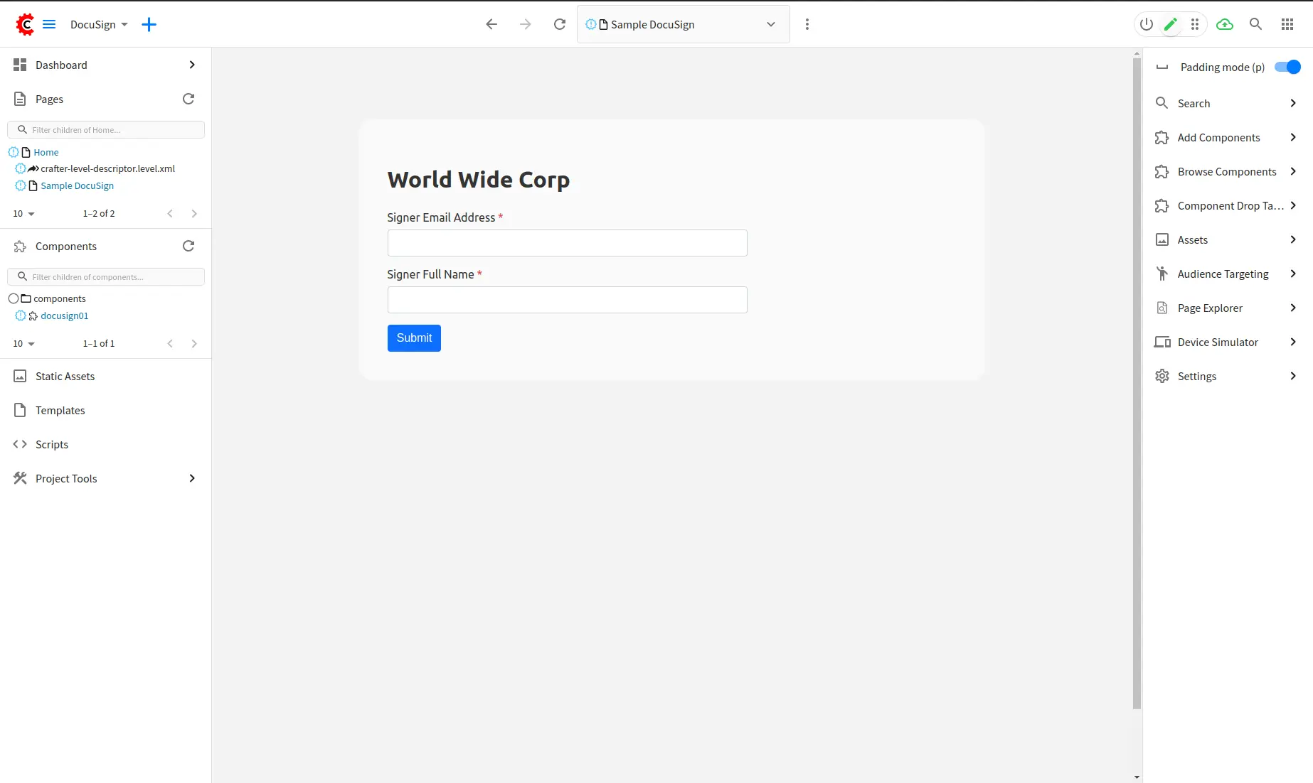 Create a page with /page/plugins/org/craftercms/plugin/docusign/docusign-page content type to display the DocuSign form in the previous step: