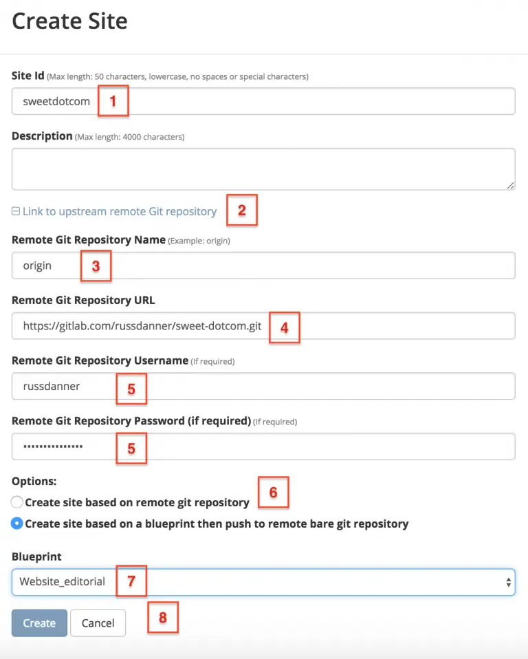 - Fill out the Create Site Form as in a similar fashion described in Step 2, except this time you chose the option to create your site based on an existing upstream repository. This can be your team’s branch or your own fork. The exact workflow is up to you.