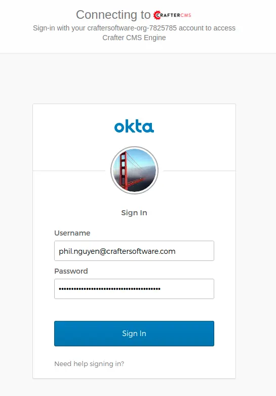 First of all, an Okta organization is required. This is usually tied to your company or a certain service, for example, https://craftersoftware.okta.com.