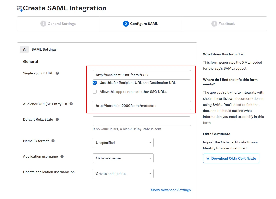 - Single sign-on URL: http://localhost:9080/saml/SSO