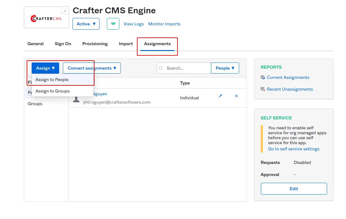 In order to log in to a website with an Okta account, an Okta admin needs to add Okta users of the organization to the Crafter Engine Application. From the Assignments tab, Click Assign and choose Assign to People.