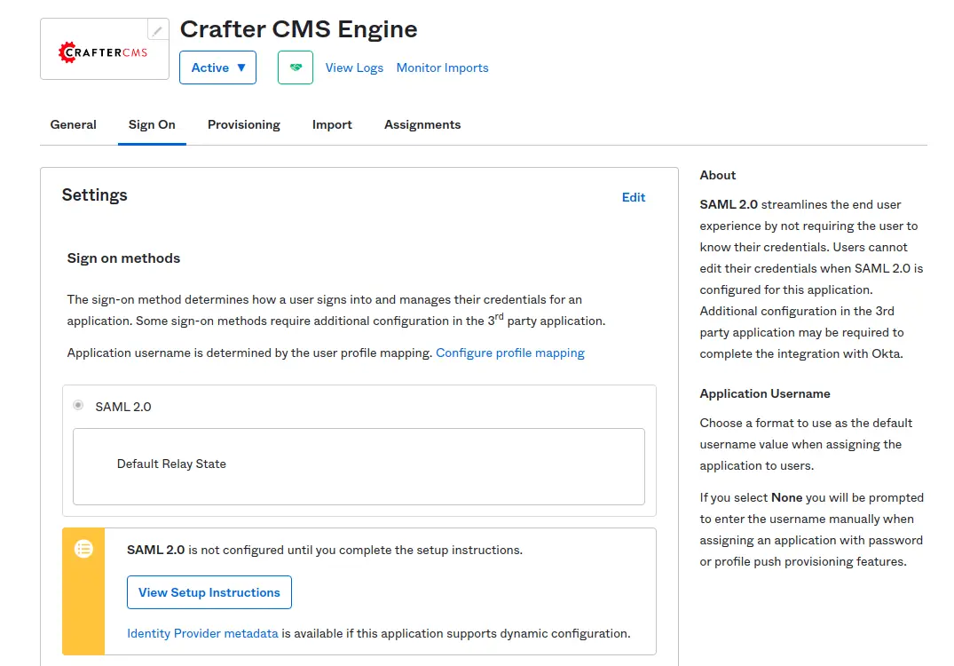 Okta is a platform in Identity-as-a-Service (IDaaS) category, a drop-in solution to add authentication and authorization services to various applications. In this tutorial, Okta acts as the Identity Provider component in the SAML standard. We will use Okta to authenticate Crafter Engine, which is the Service Provider in this case.
