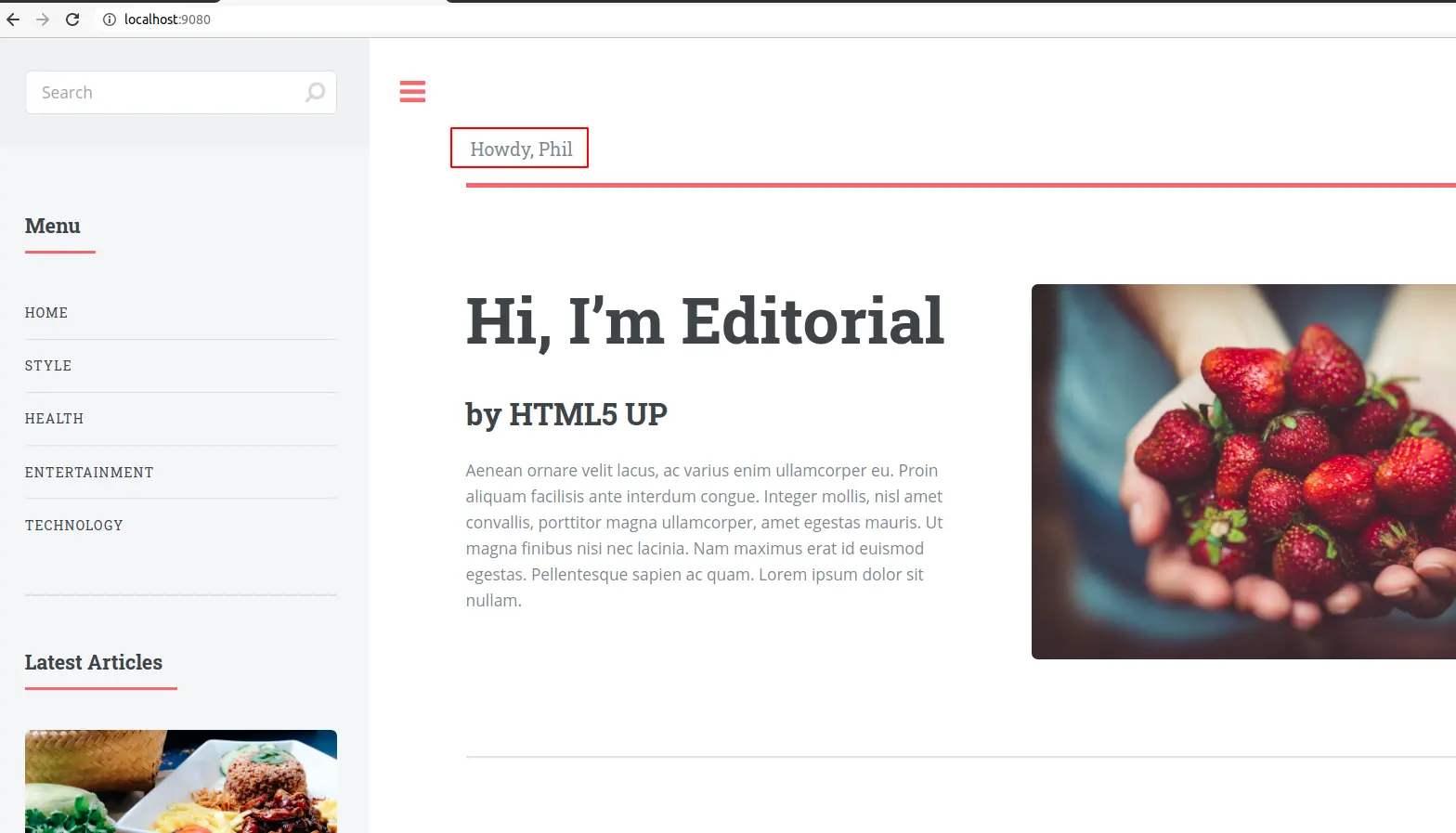 On the Home page, notice that it displays “Howdy, <Your-First-Name>”. This indicates this user is logged in and the Crafter Engine could read the attributes configured from Okta. Authenticated information is stored in a variable named authToken and therefore could be used as a template variable. Refer to this document to understand more about authenticated attributes: Engine Site Security Guide — CrafterCMS documentation.