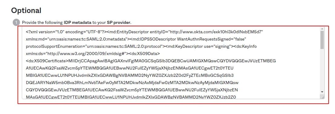 - <identityProviderName> tag: This is the information from “Identity Provider Issuer” configured in Okta Application. Retrieve this by going back to Okta Application, select Sign On tab, click View Setup Instructions, then copy the value.