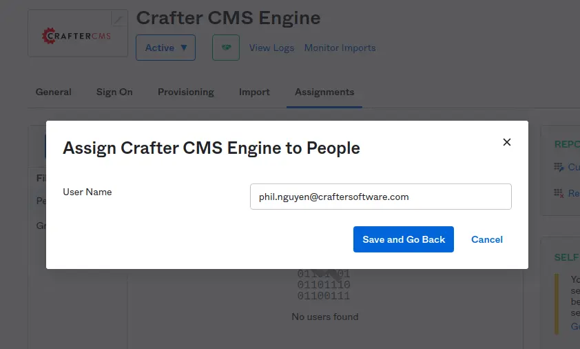 Within displaying popup, confirm assigning a user with a correct email address then click Save and Go Back.