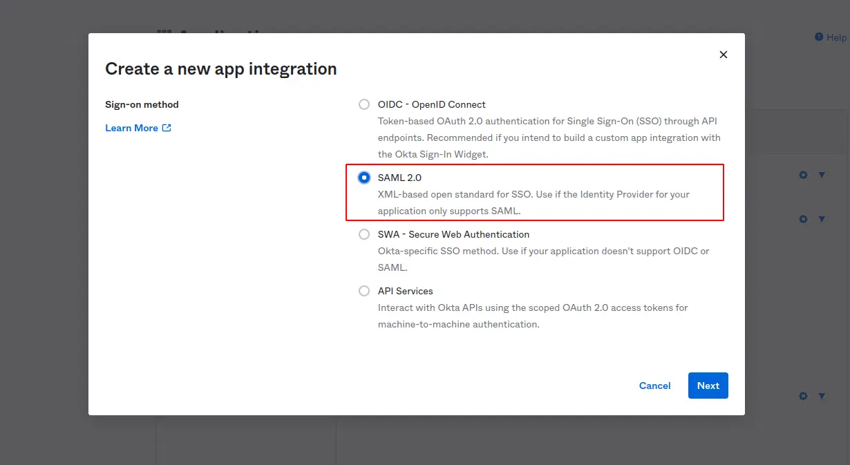 Log in to your organization Okta account, from Dashboard, select Applications > Create App Integration.