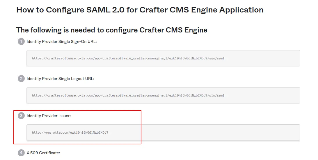 The configuration is exactly as mentioned in this document: Engine SAML2 Configuration — CrafterCMS documentation.