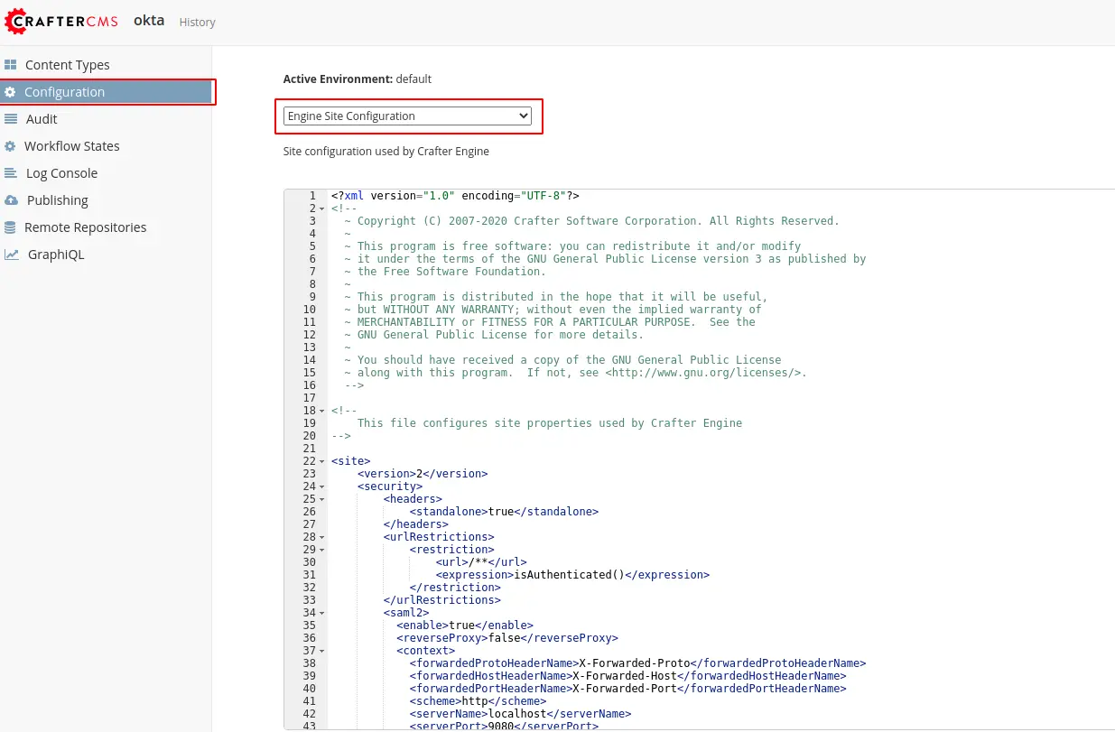 In the above section, we mentioned how to configure Crafter Studio for Okta authentication. In order to make this work in the Delivery Environment, we also have to publish the whole site to Delivery and configure Crafter Engine for the Delivery Environment as well