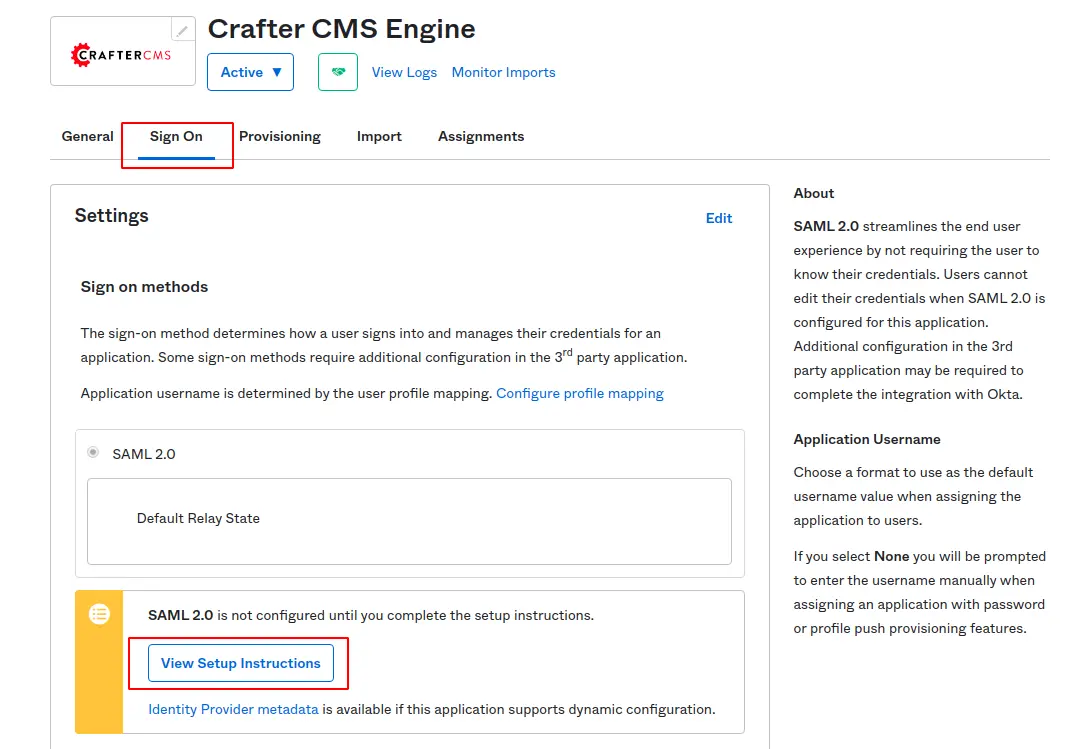Go back to Okta Application, select Sign On tab, click View Setup Instructions.