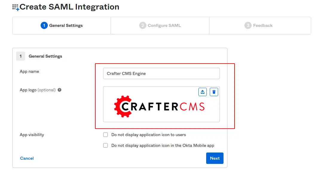 Enter App name (Ex: Crafter CMS Engine) and optionally upload an app logo.